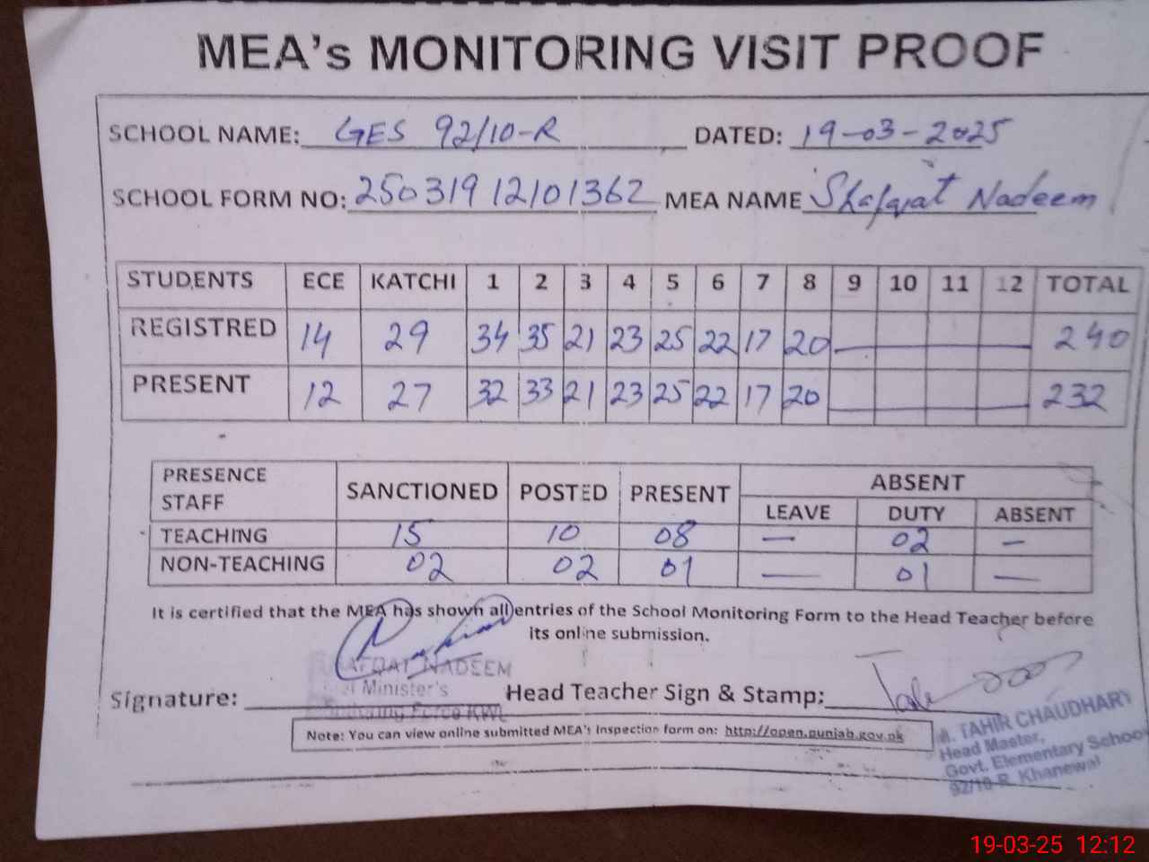 | Attendance Register | Head Teacher | MEA with School | Visit Proof |