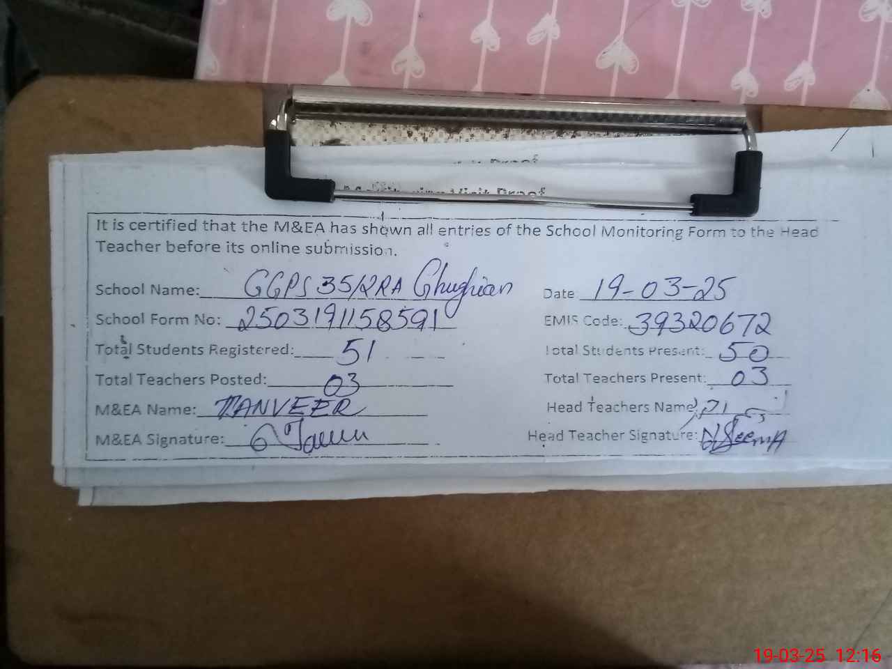 | Certified that this School was Inspected by the Undersigned MEA/DMO Today and the Information Stated Above is as Per Record. | |||||