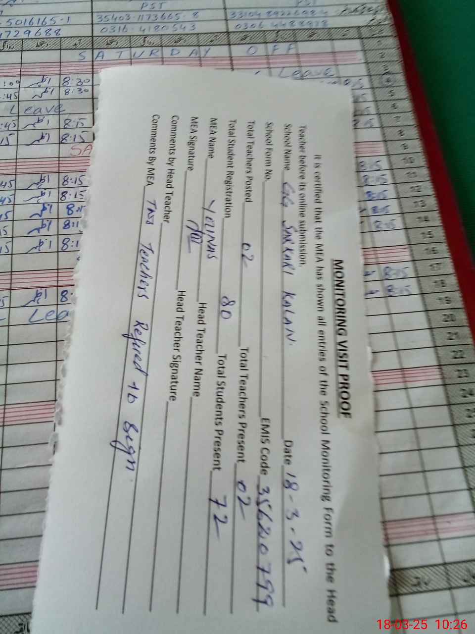 | Attendance Register | Head Teacher | MEA with School | Visit Proof |