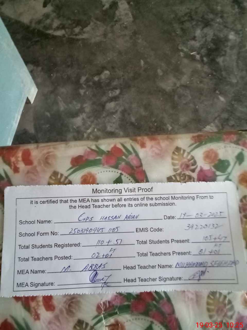 | Attendance Register | Head Teacher | MEA with School | Visit Proof |