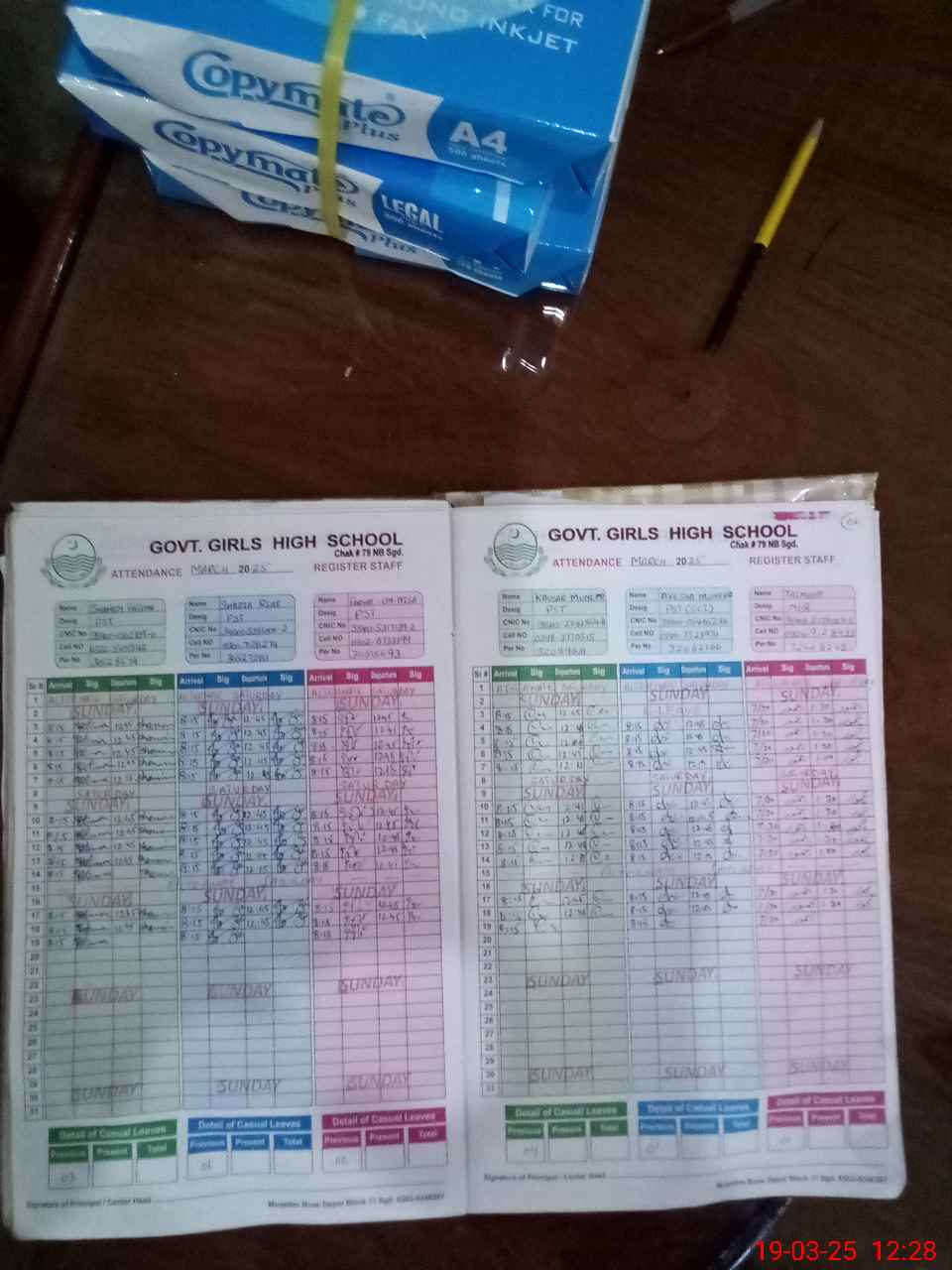 | CNIC | Full Name | Designation | R/C | Absence During Last Calender Month |