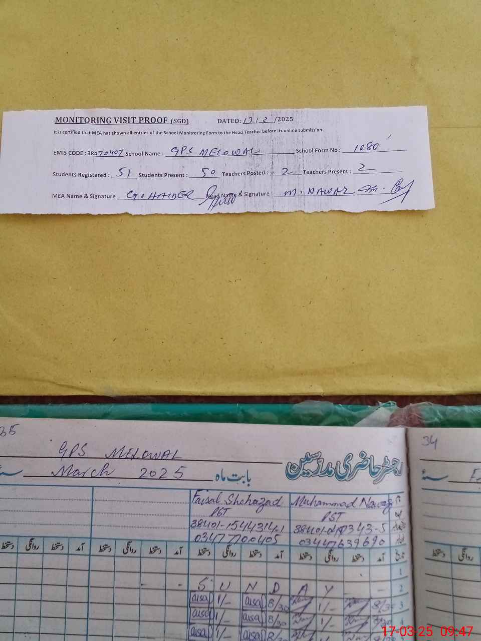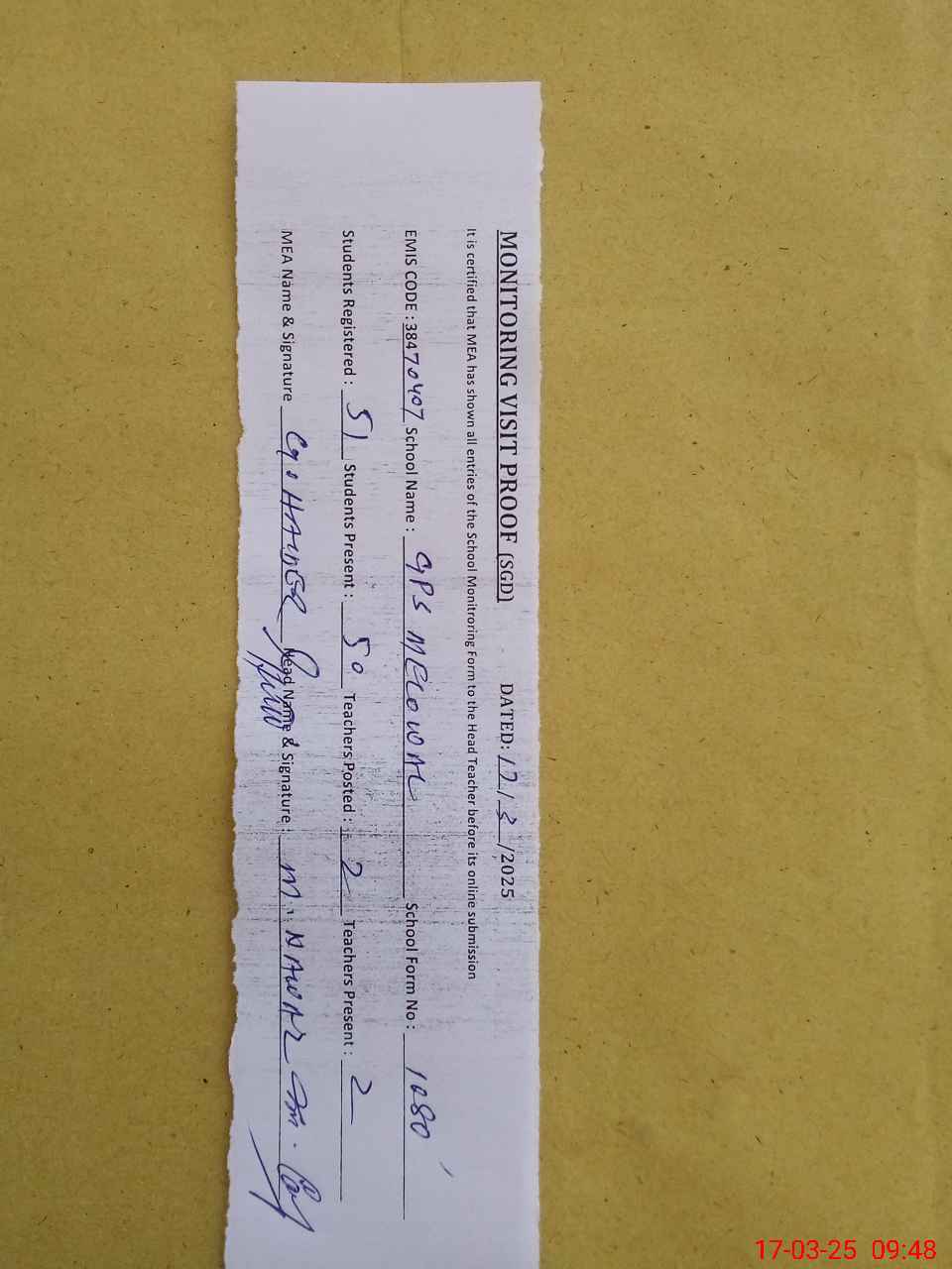 | Attendance Register | Head Teacher | MEA with School | Visit Proof |