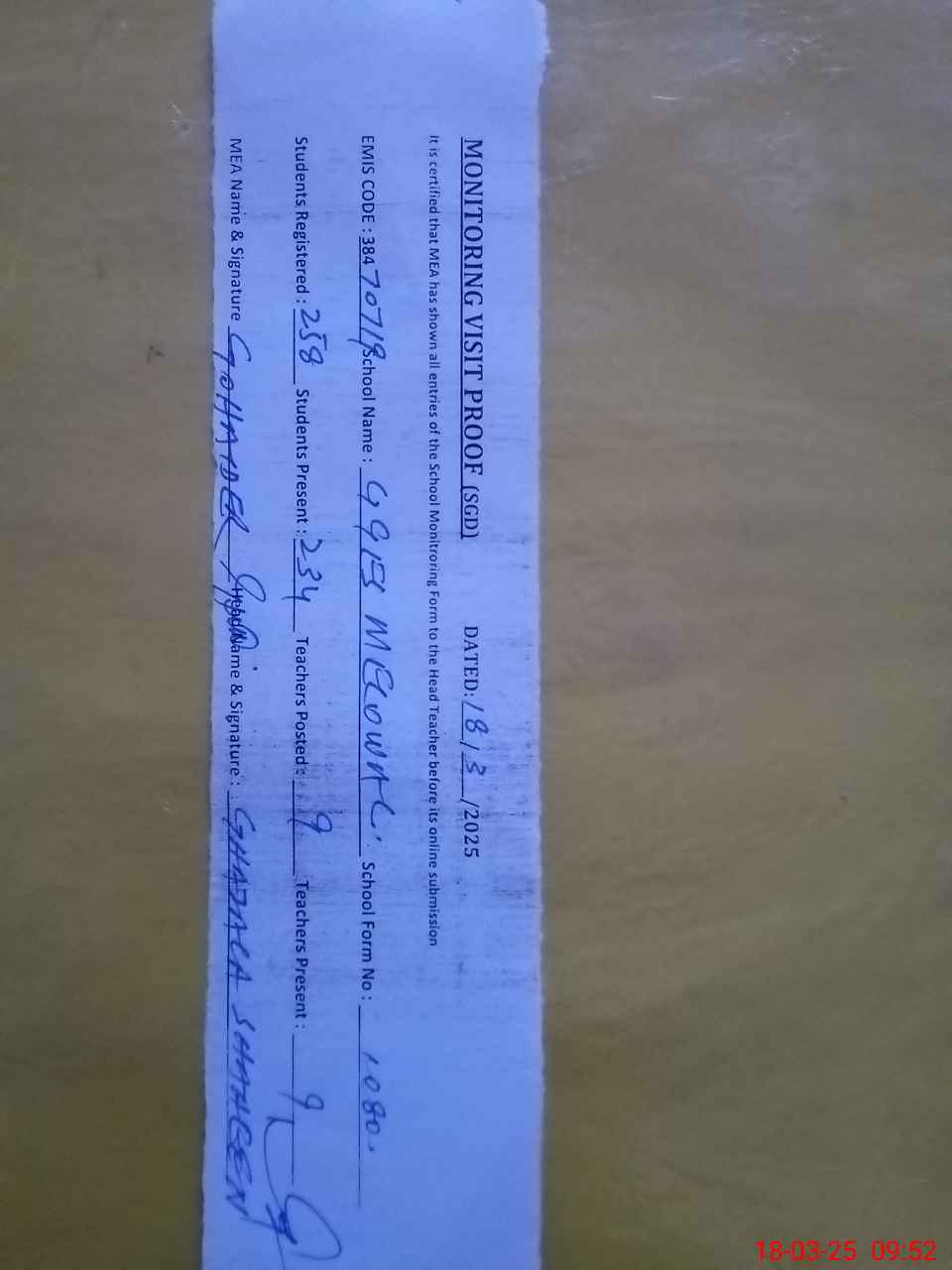 | Certified that this School was Inspected by the Undersigned MEA/DMO Today and the Information Stated Above is as Per Record. | |||||