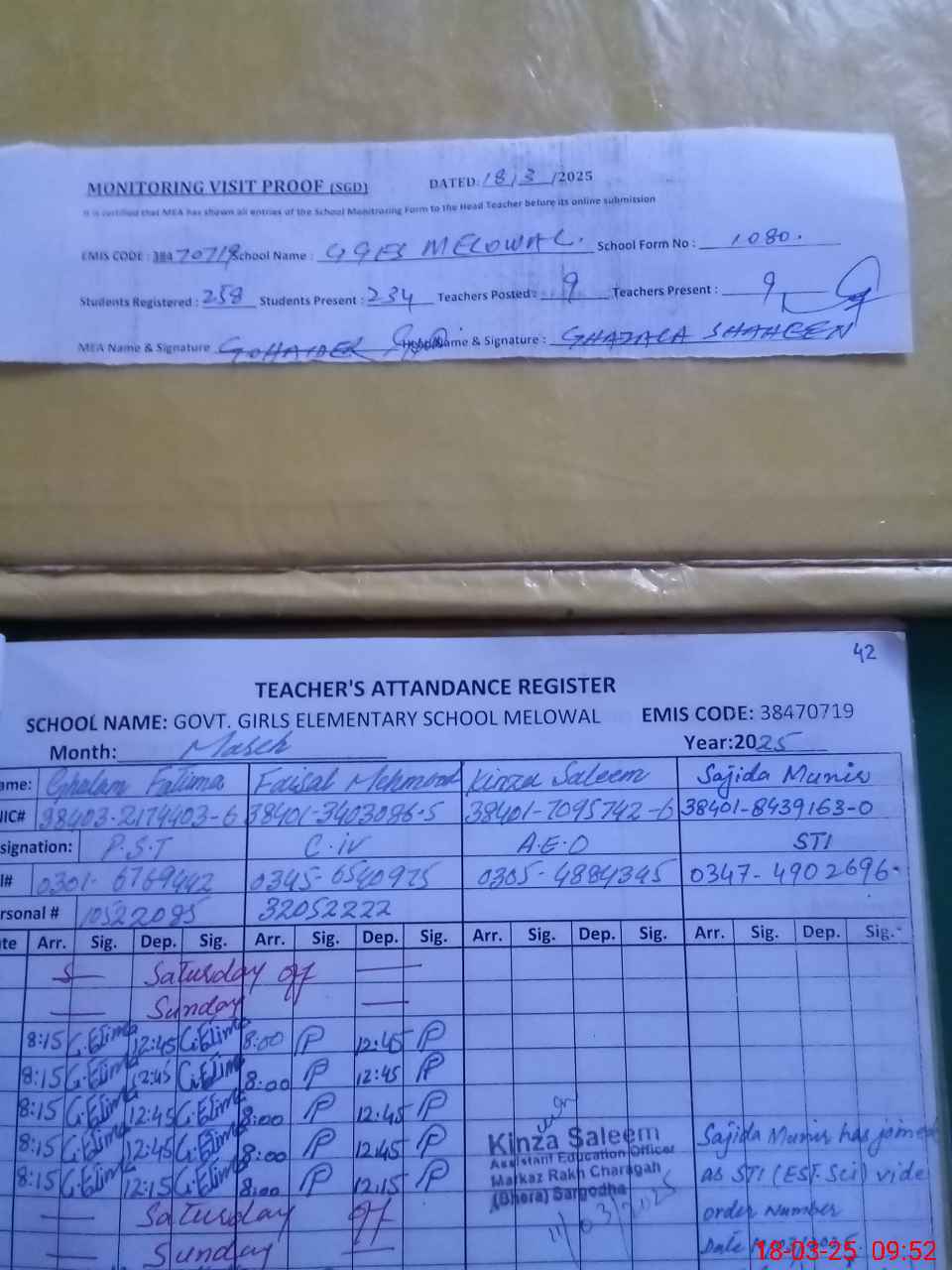 | Attendance Register | Head Teacher | MEA with School | Visit Proof |