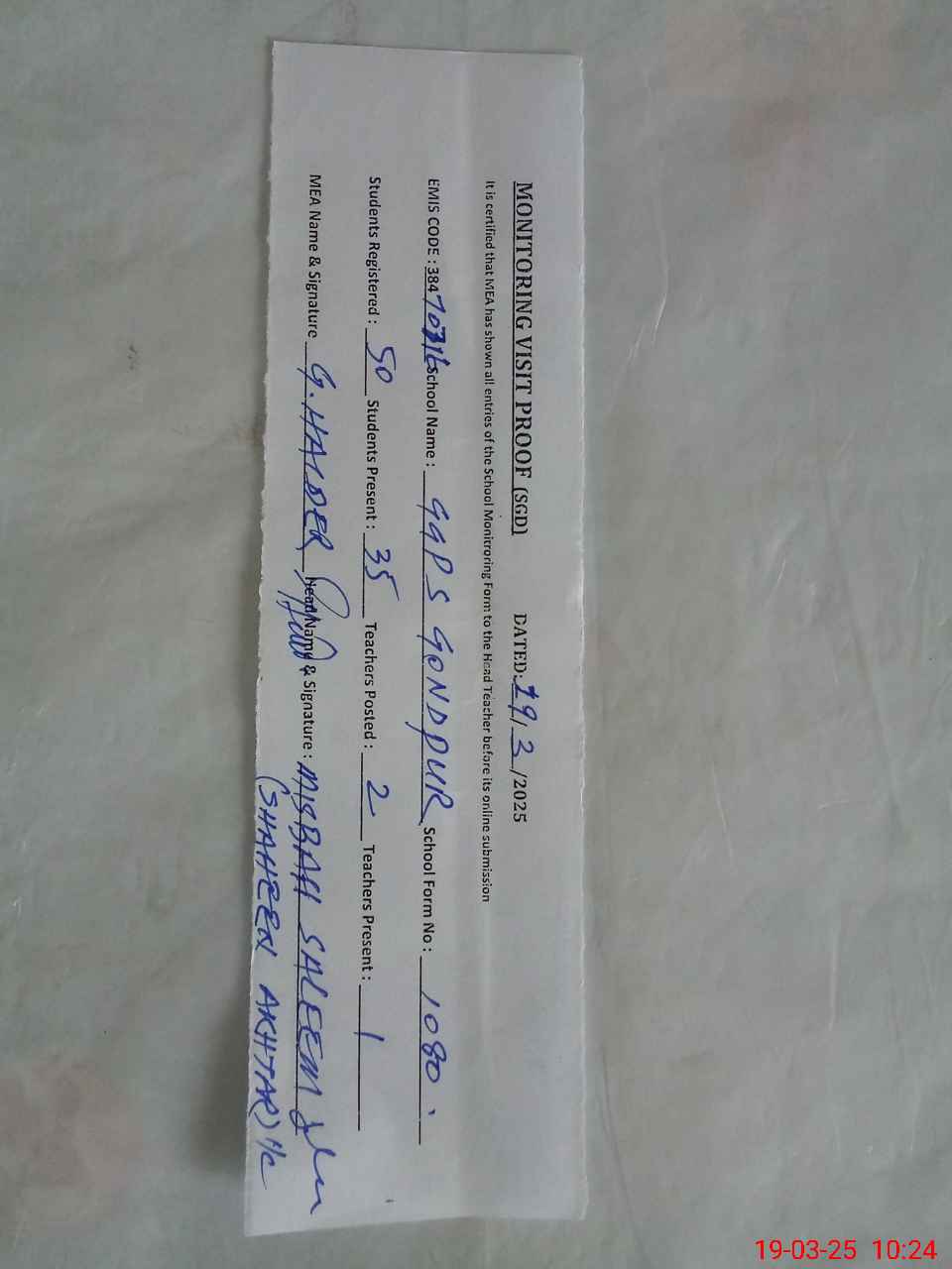 | Certified that this School was Inspected by the Undersigned MEA/DMO Today and the Information Stated Above is as Per Record. | |||||