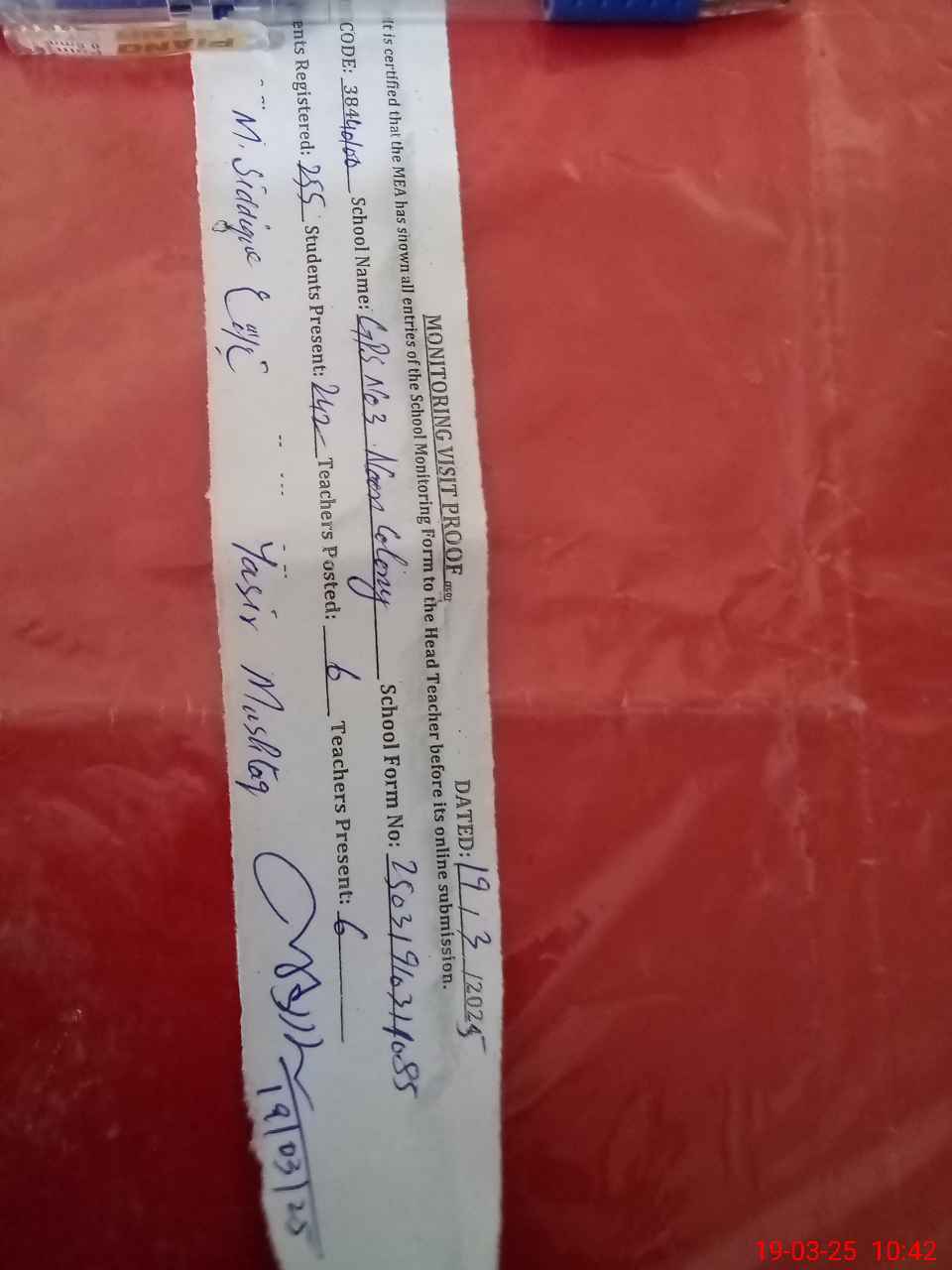 | Certified that this School was Inspected by the Undersigned MEA/DMO Today and the Information Stated Above is as Per Record. | |||||