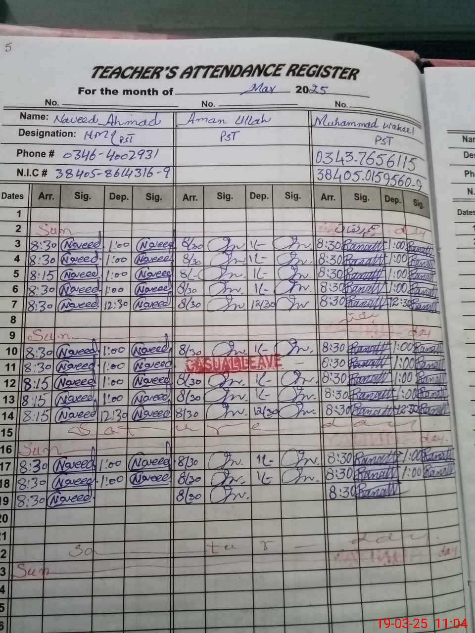 | CNIC | Full Name | Designation | R/C | Absence during last cal. month |