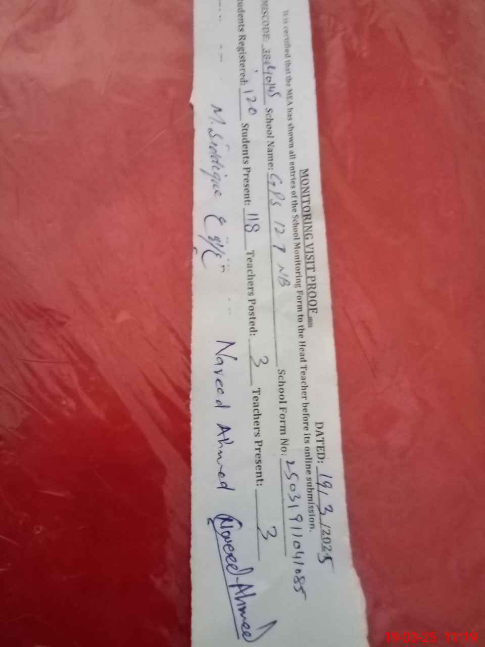 | Certified that this School was Inspected by the Undersigned MEA/DMO Today and the Information Stated Above is as Per Record. | |||||