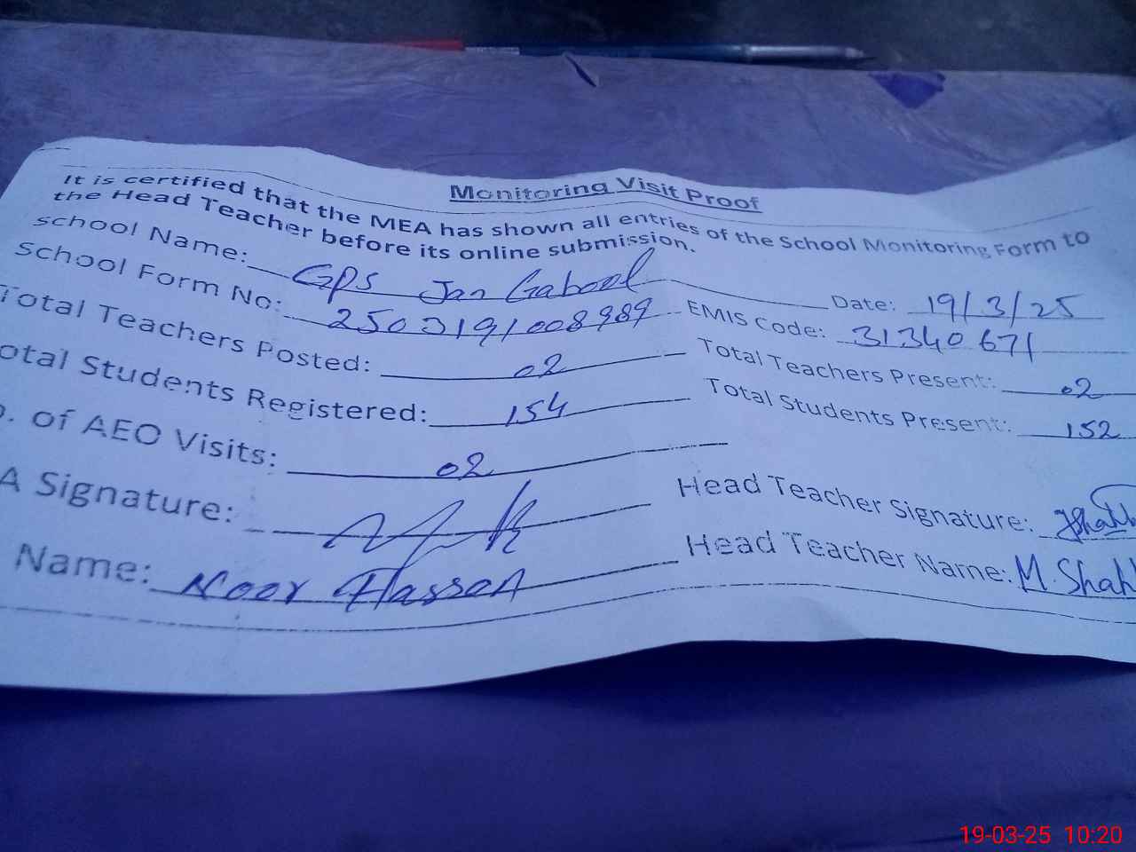 | Attendance Register | Head Teacher | MEA with School | Visit Proof |