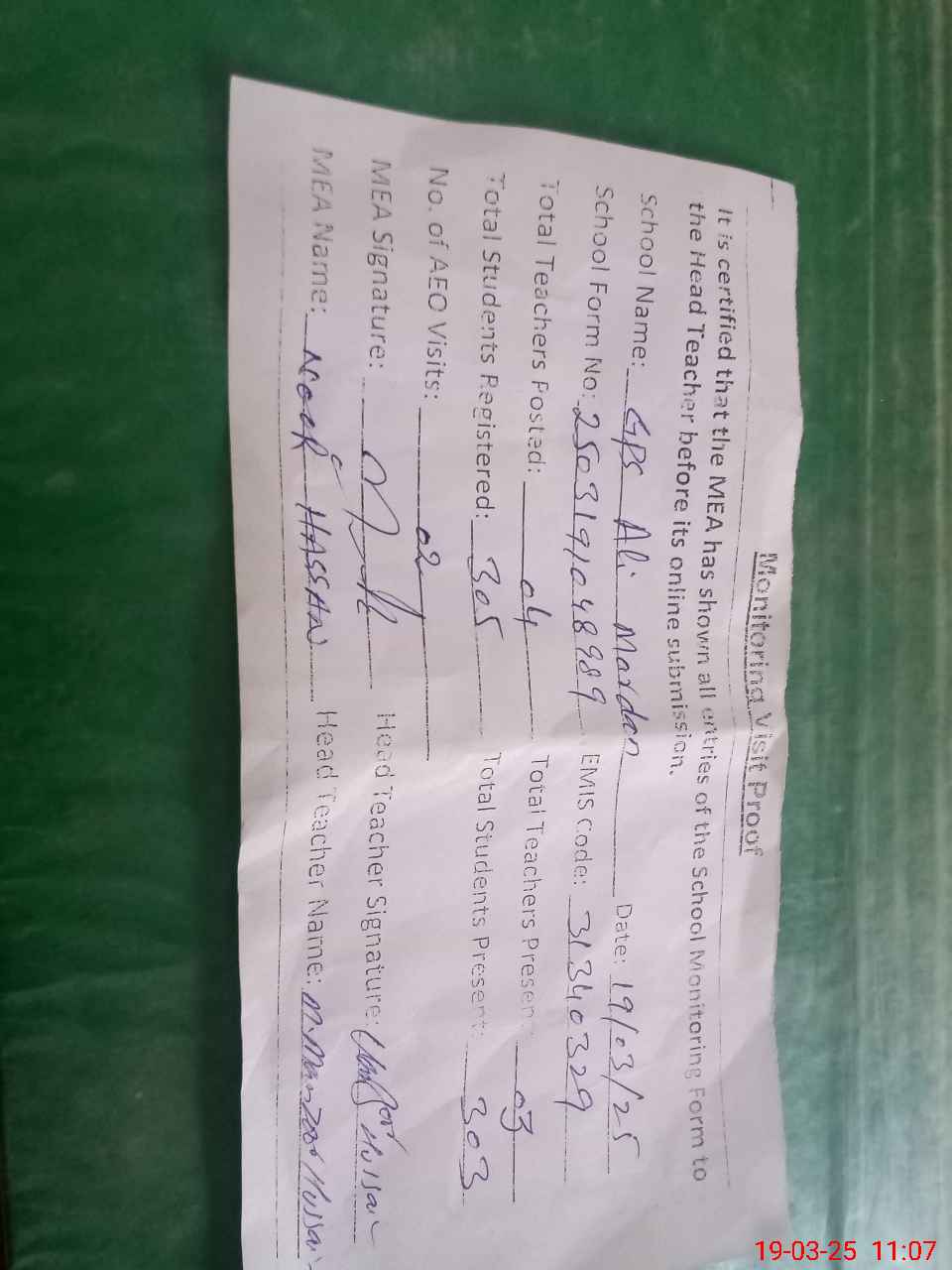 | Attendance Register | Head Teacher | MEA with School | Visit Proof |