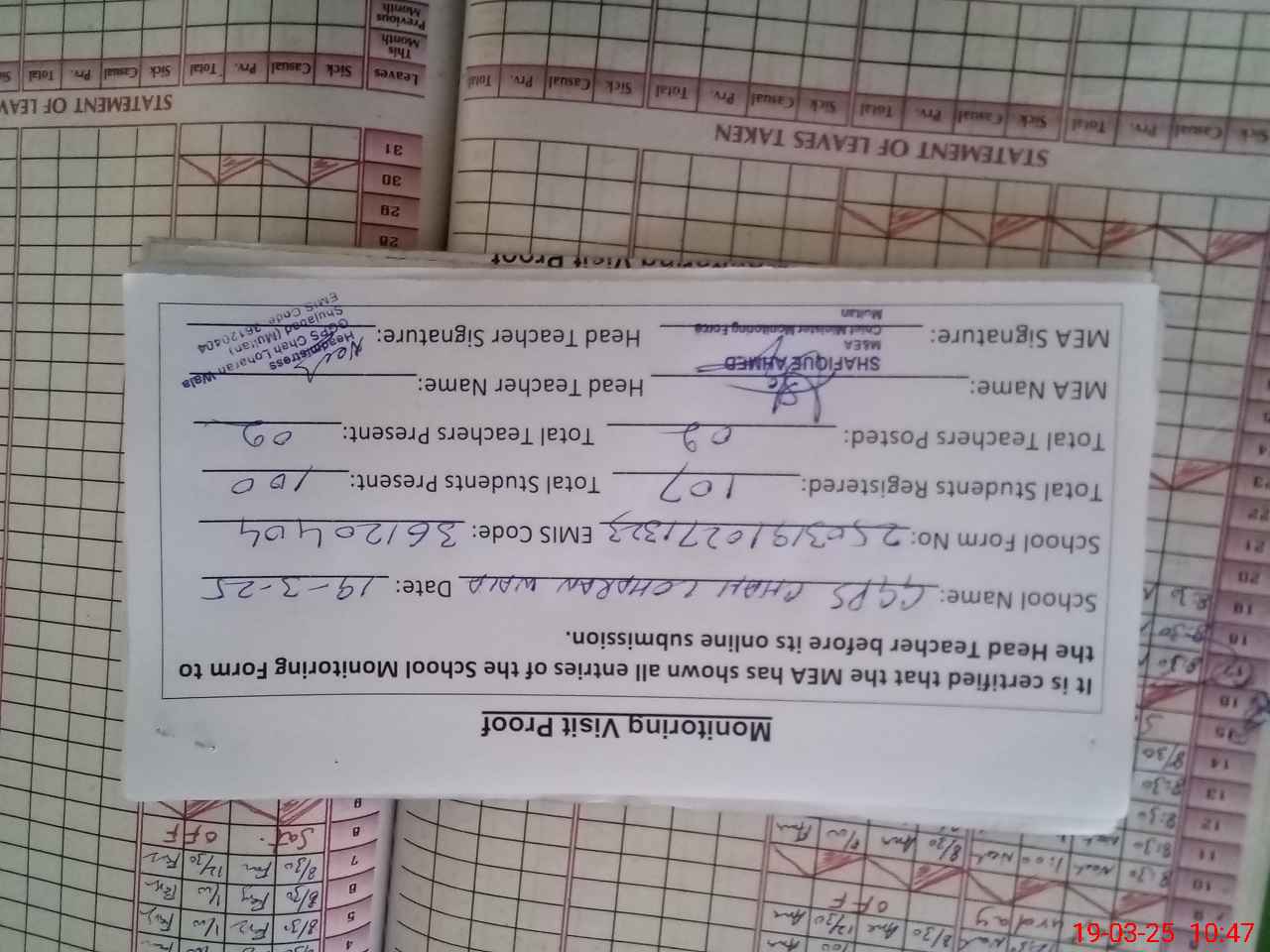 | Attendance Register | Head Teacher | MEA with School | Visit Proof |