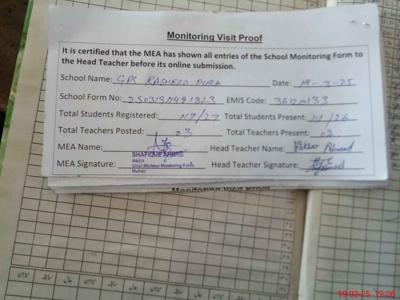 | Attendance Register | Head Teacher | MEA with School | Visit Proof |