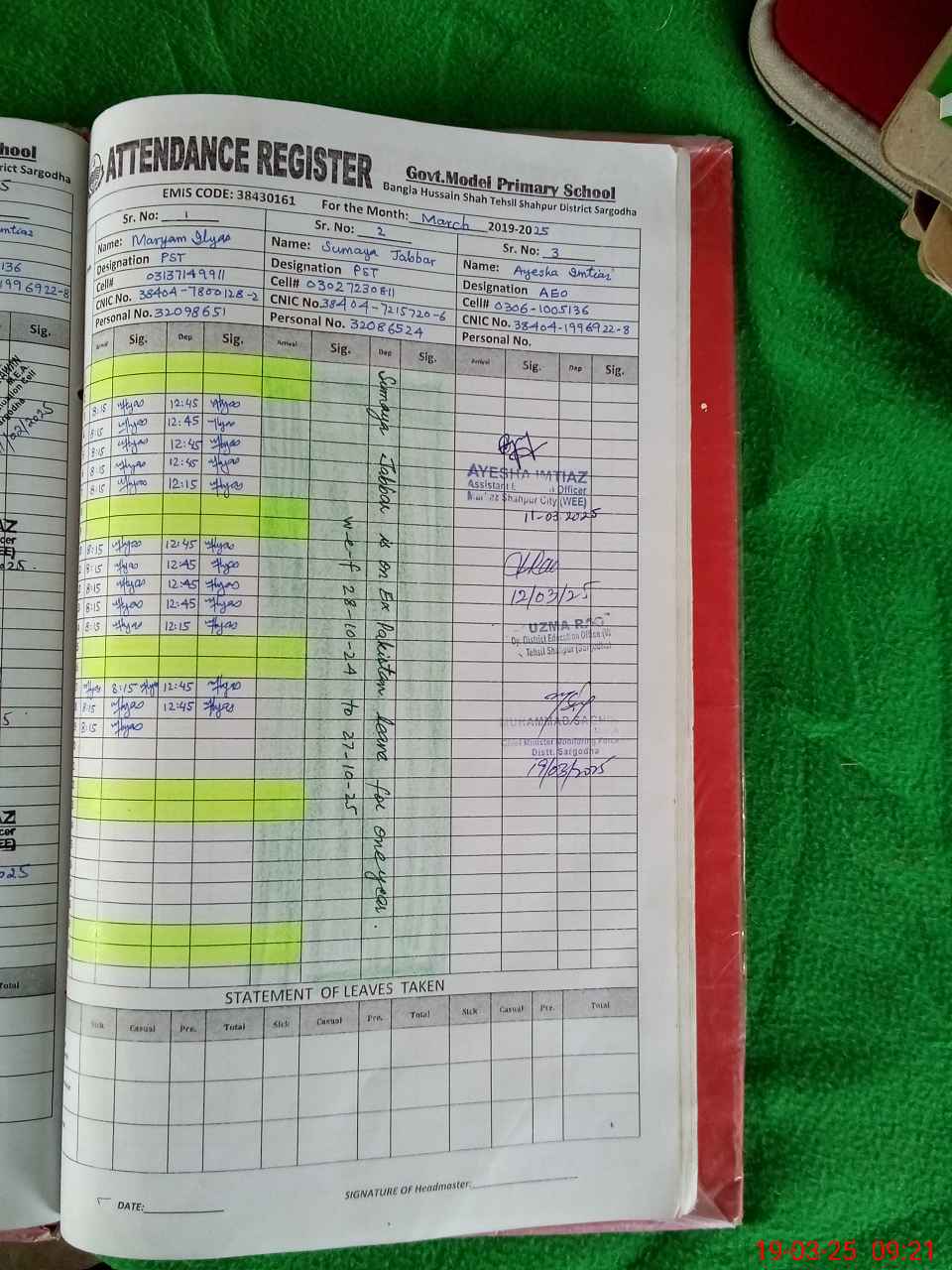 | Name: MA**** IL**** Designation: (School Headmaster's/Headmistress's) PST Phone/Cell Number: 03**** |