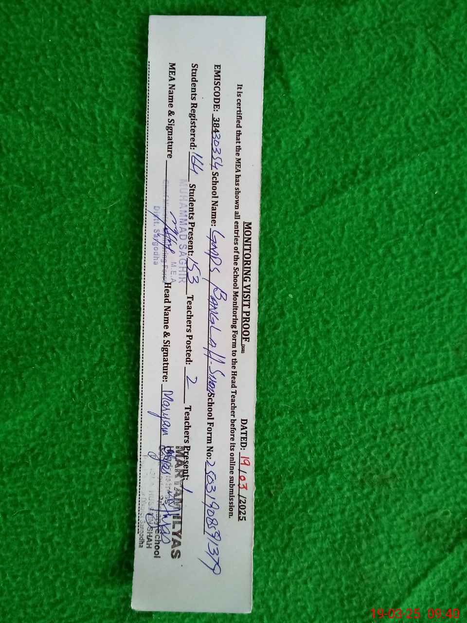 | Certified that this School was Inspected by the Undersigned MEA/DMO Today and the Information Stated Above is as Per Record. | |||||