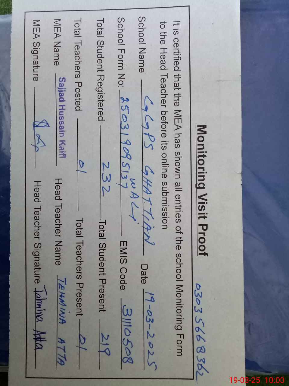 | EMIS Code: 31110508 | Name of School: GGPS GHATTIAN WALI | |||
