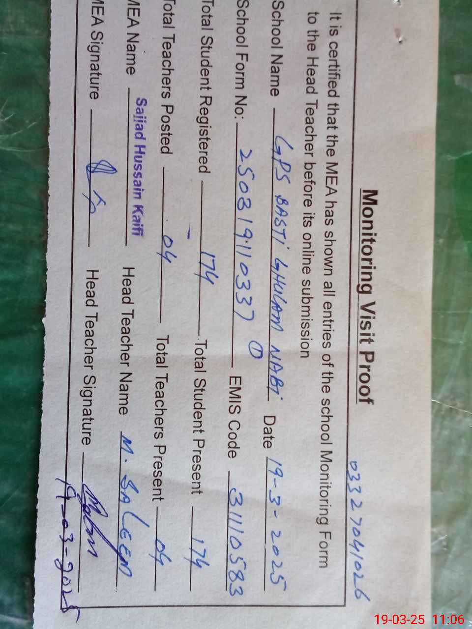 | Name: MU**** SA**** Designation: (School Headmaster's/Headmistress's) PST Phone/Cell Number: 03**** |