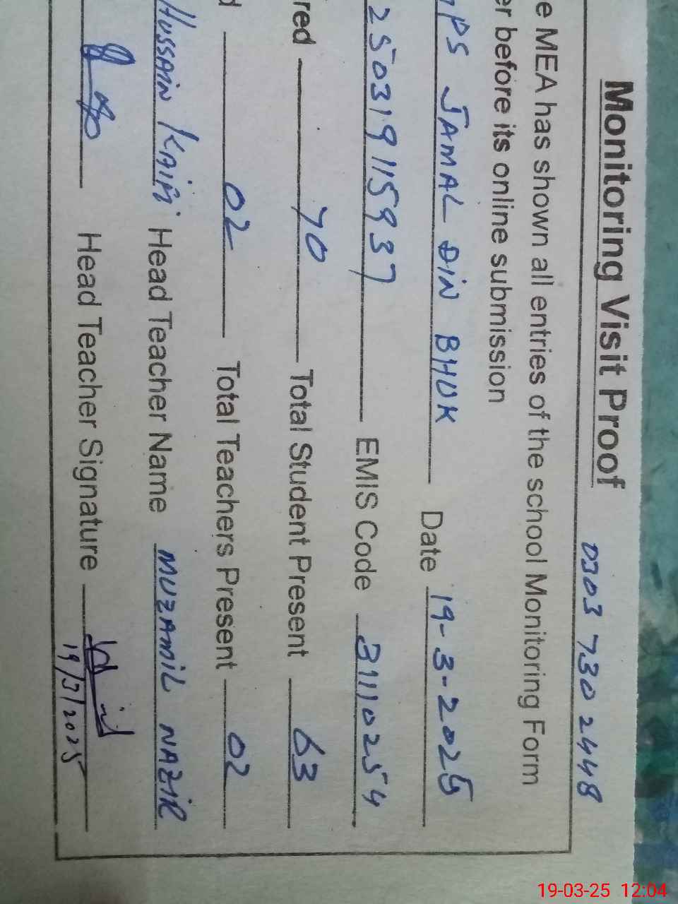 | Attendance Register | Head Teacher | MEA with School | Visit Proof |