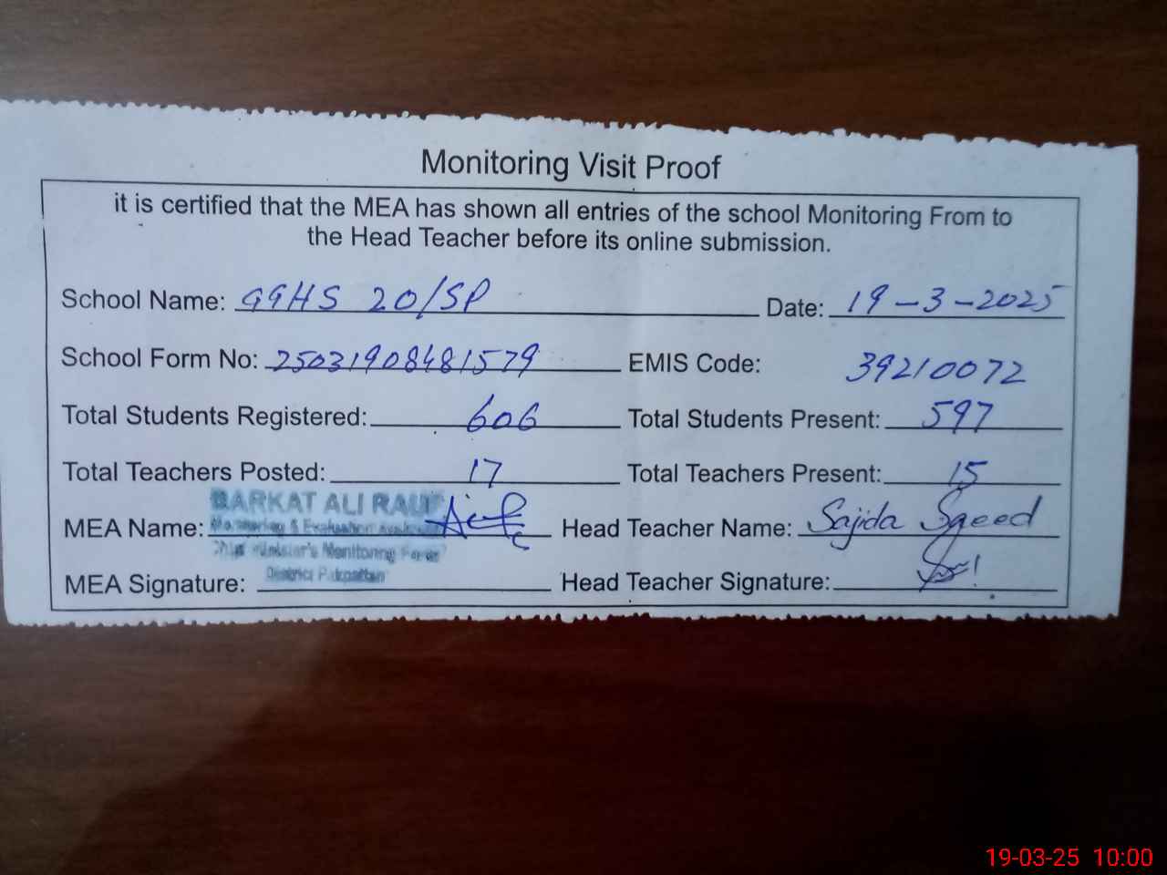 | Attendance Register | Head Teacher | MEA with School | Visit Proof |