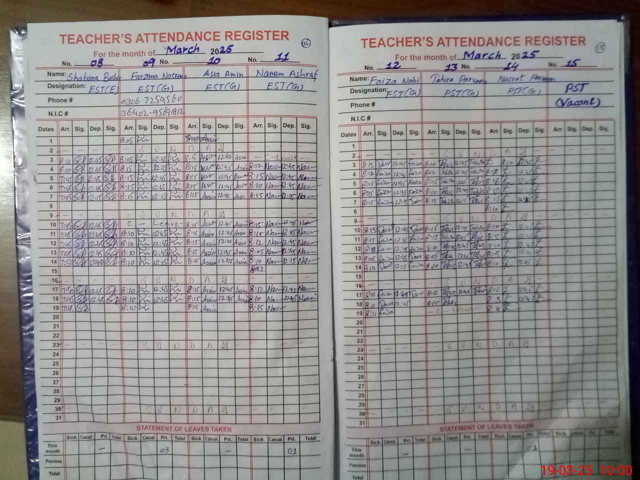 | CNIC | Full Name | Designation | R/C | Absence During Last Calender Month |