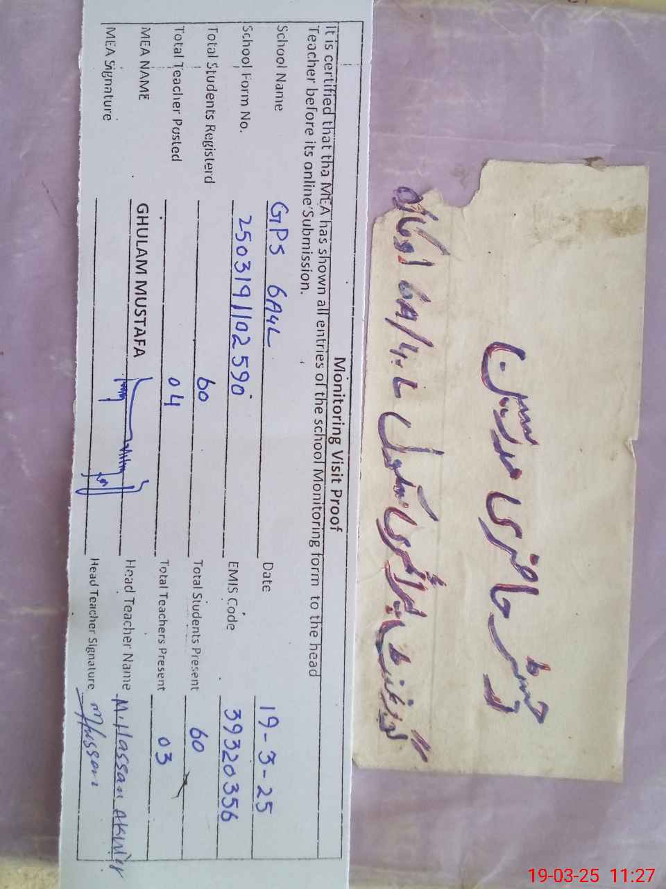 | Name: MU**** HA**** AK**** Designation: (School Headmaster's/Headmistress's) PTC/JV Phone/Cell Number: 03**** |