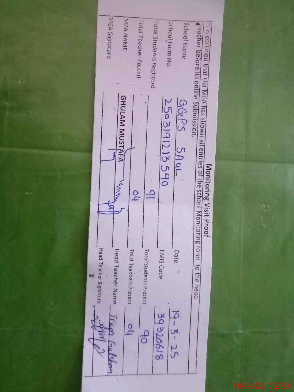 | Attendance Register | Head Teacher | MEA with School | Visit Proof |
