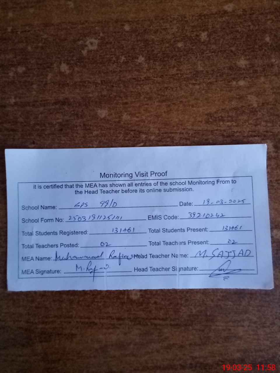 | Attendance Register | Head Teacher | MEA with School | Visit Proof |