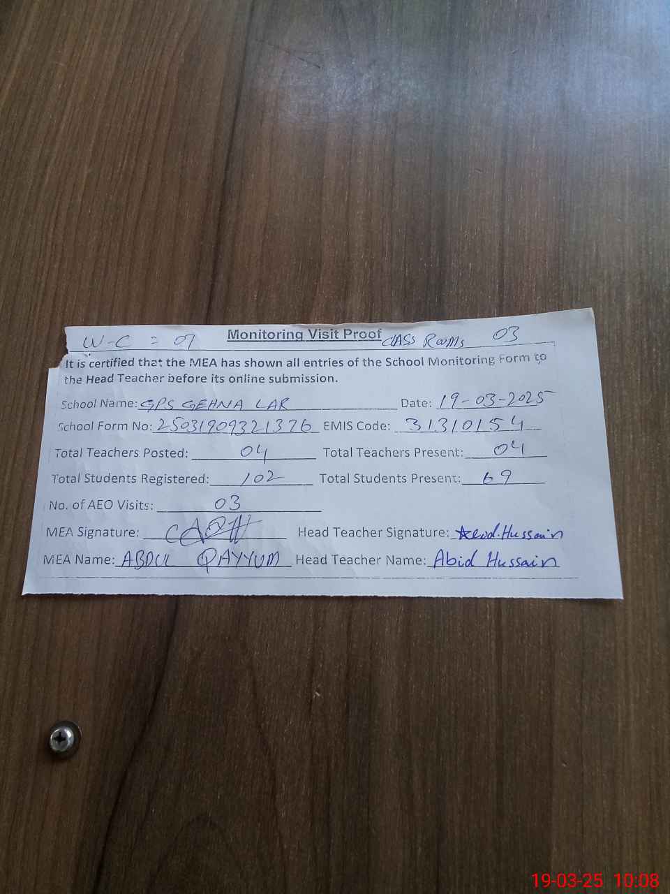 | EMIS Code: 31310154 | Name of School: GPS GHENA LAR MOUZA GHOTIA | |||