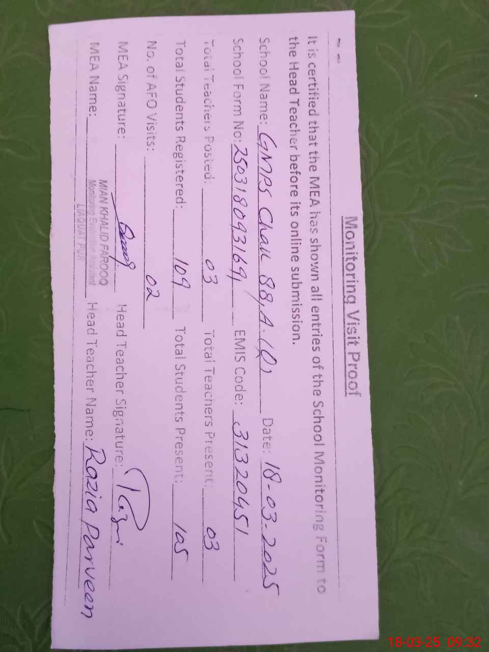 | EMIS Code: 31320451 | Name of School: GMPS CHAK NO. 88/A QADEEM | |||