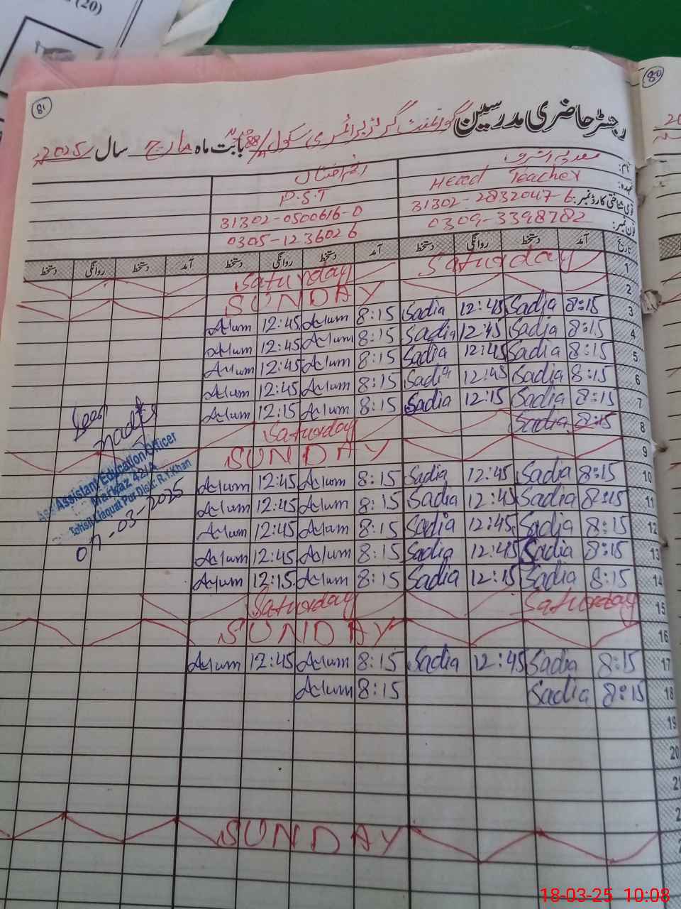 | Name: Sa**** As**** Designation: (School Headmaster's/Headmistress's) PST Phone/Cell Number: 03**** |