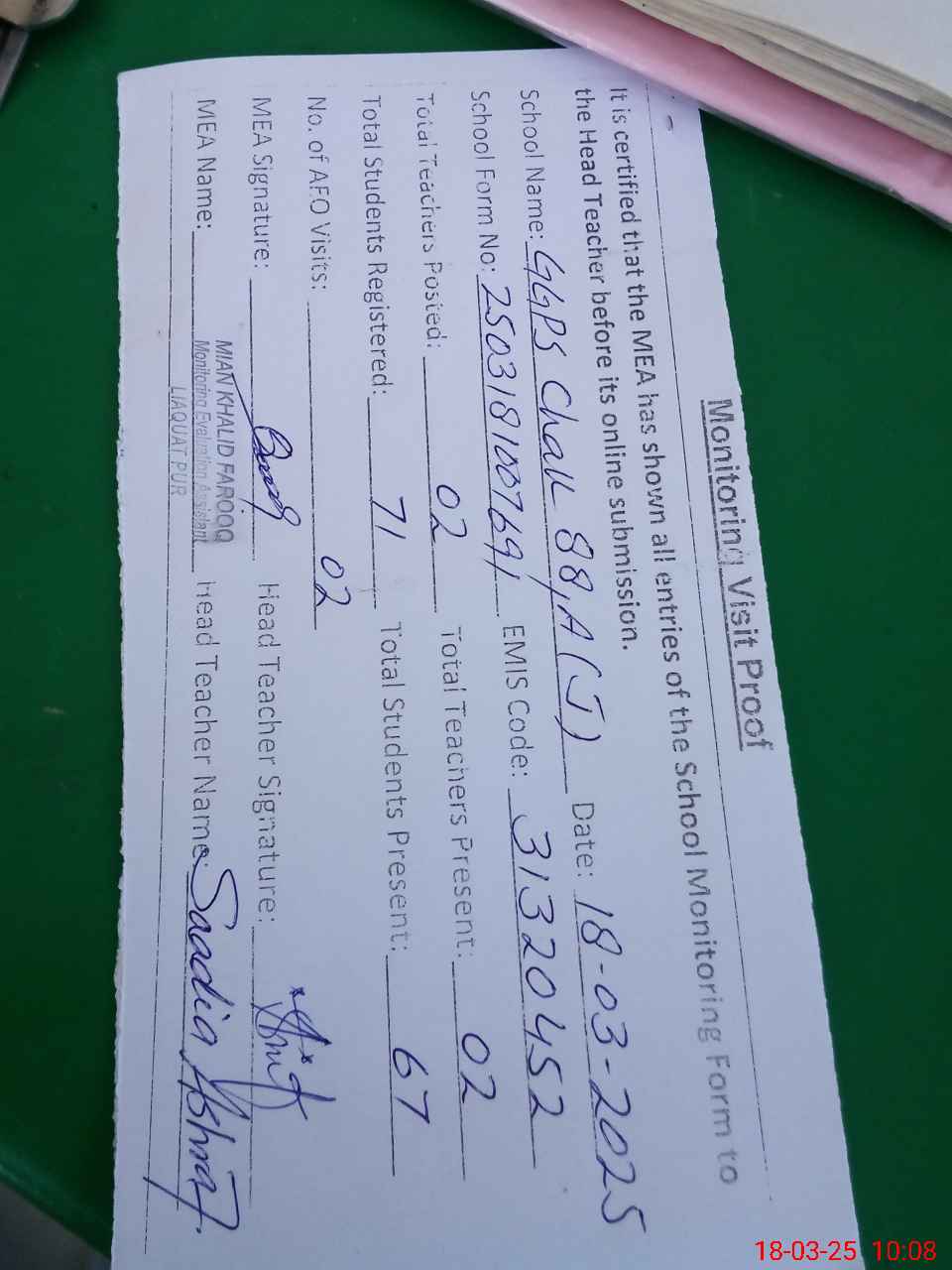 | Attendance Register | Head Teacher | MEA with School | Visit Proof |