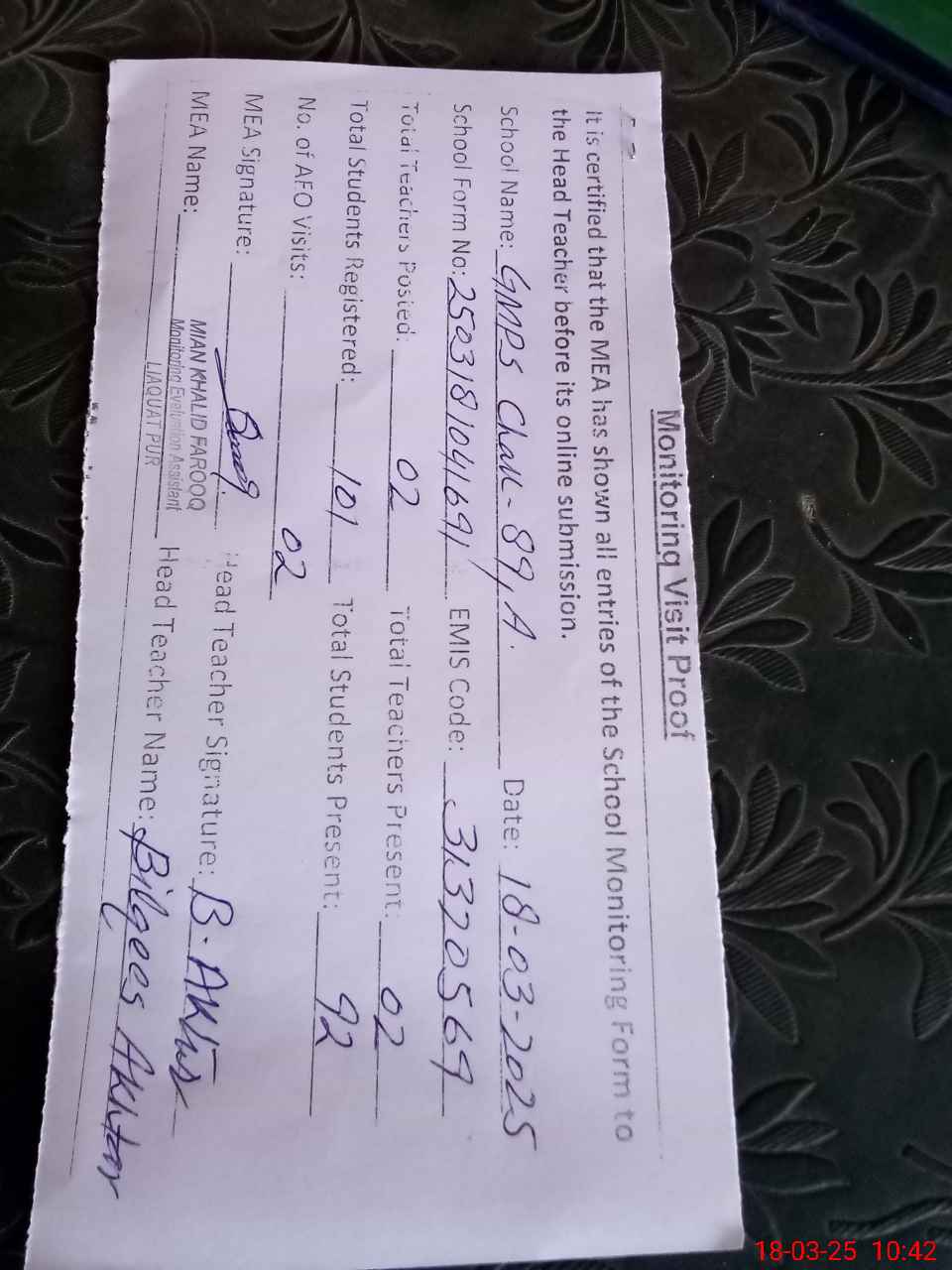 | Attendance Register | Head Teacher | MEA with School | Visit Proof |