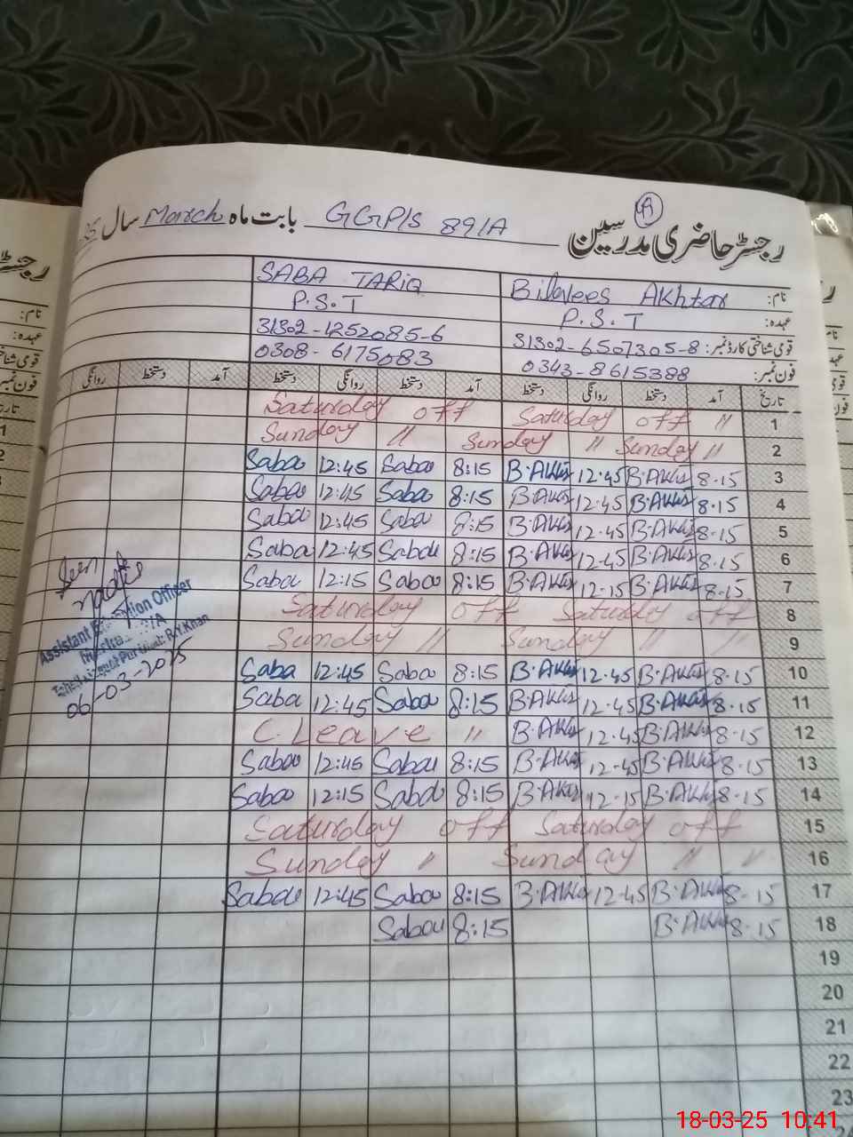 | CNIC | Full Name | Designation | R/C | Absence During Last Calender Month |