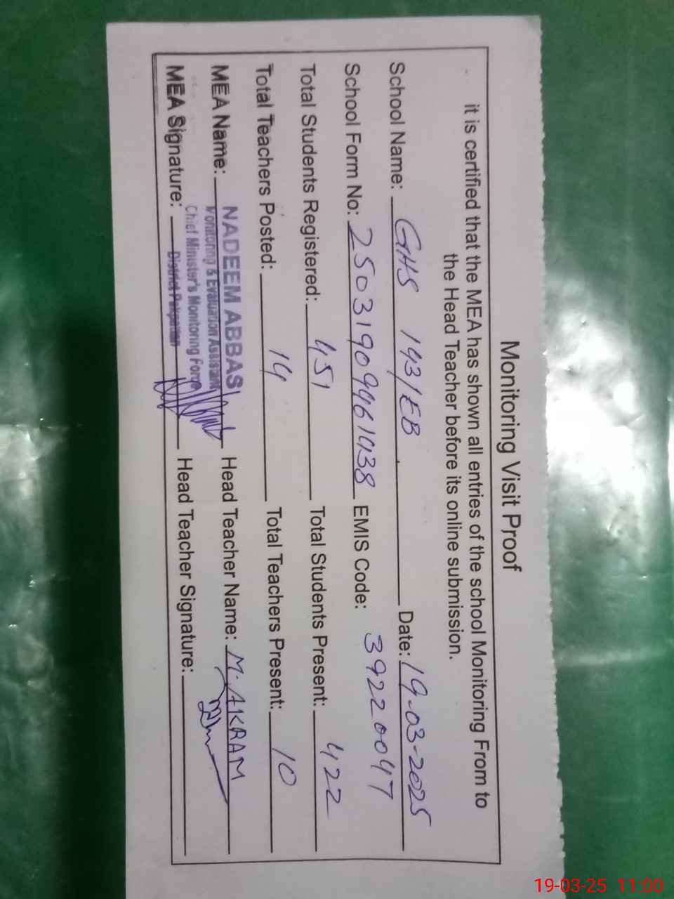 | Attendance Register | Head Teacher | MEA with School | Visit Proof |