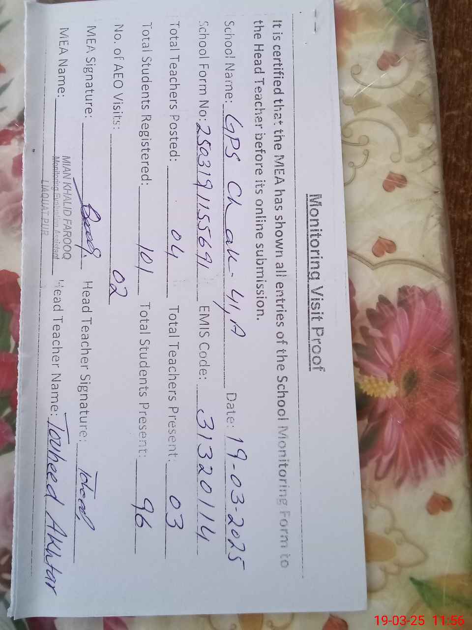 | Attendance Register | Head Teacher | MEA with School | Visit Proof |