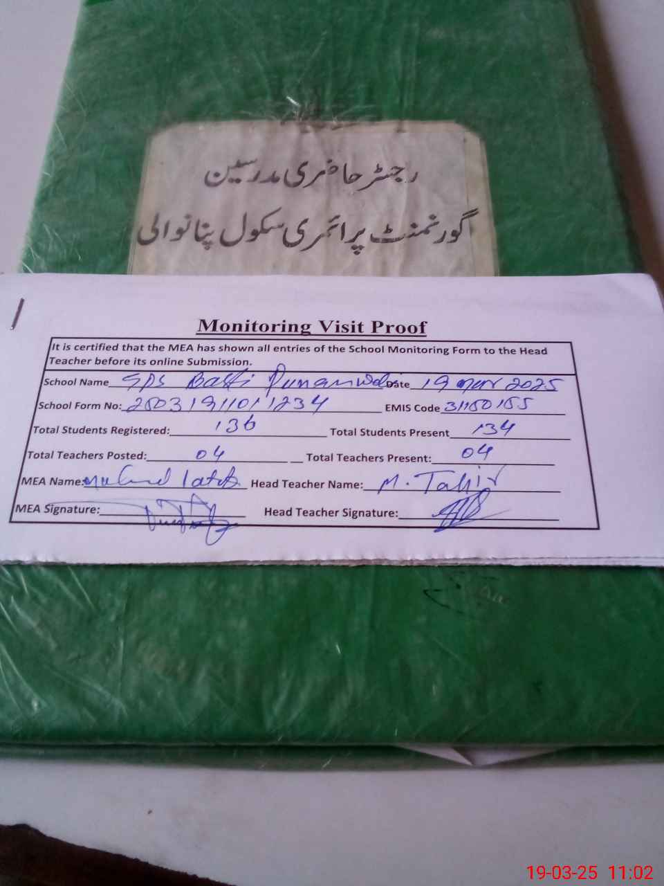 | Attendance Register | Head Teacher | MEA with School | Visit Proof |