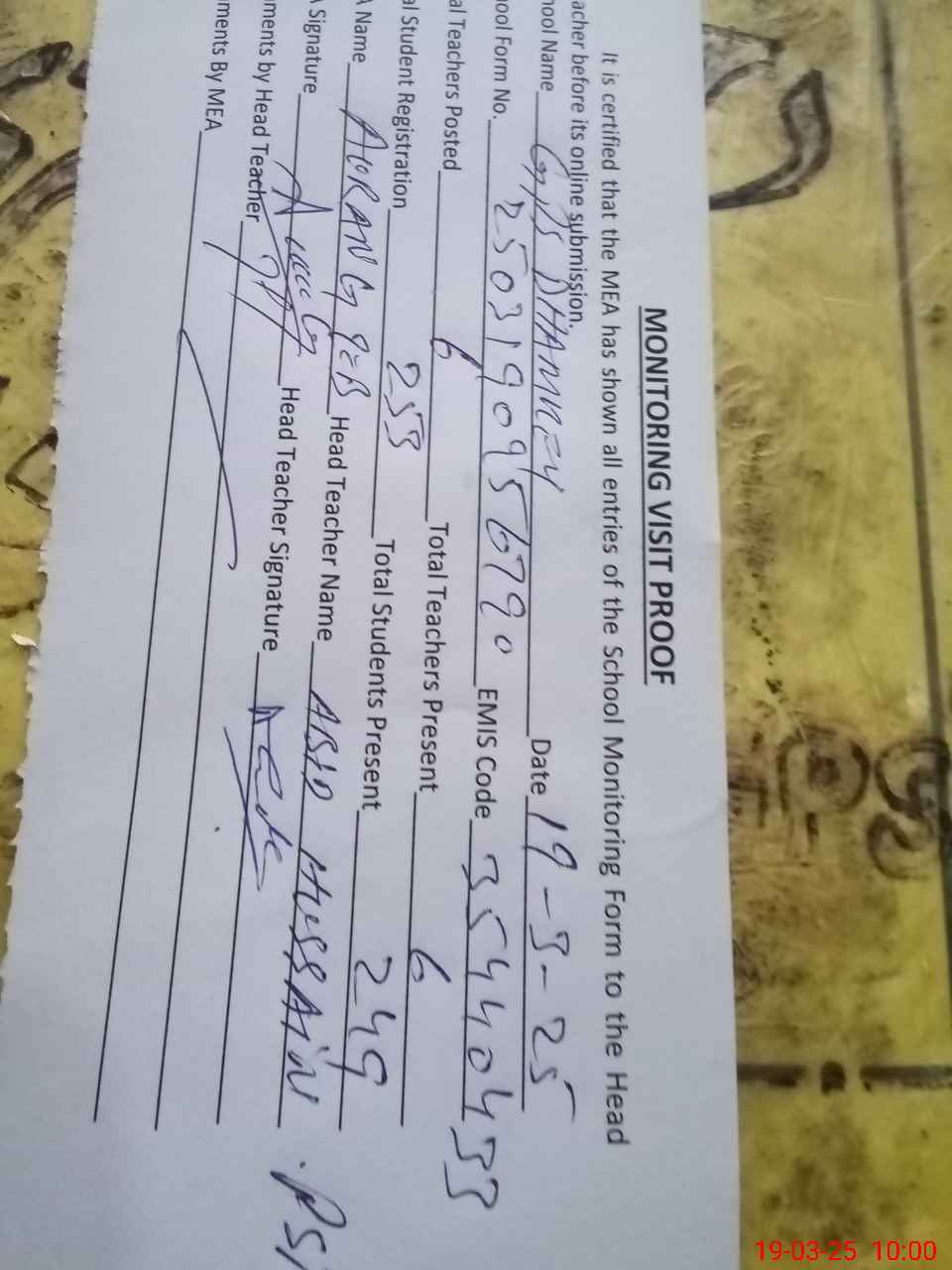 | Attendance Register | Head Teacher | MEA with School | Visit Proof |