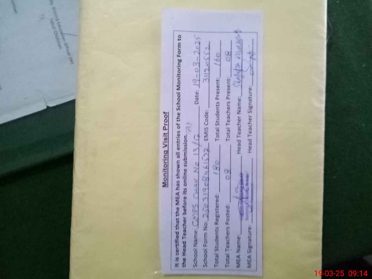 | Attendance Register | Head Teacher | MEA with School | Visit Proof |