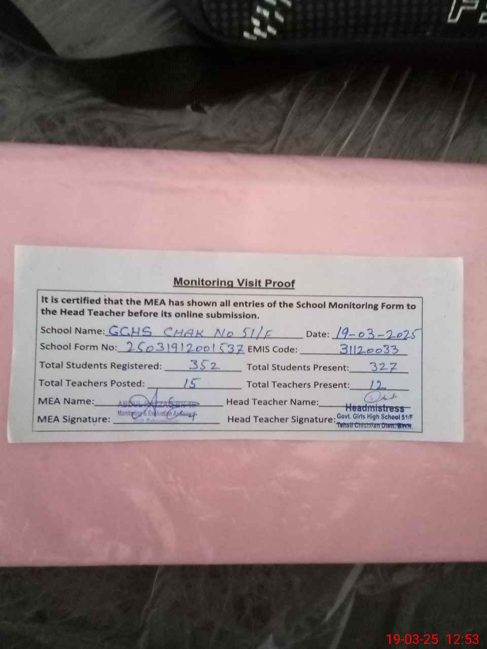 | Certified that this School was Inspected by the Undersigned MEA/DMO Today and the Information Stated Above is as Per Record. | |||||