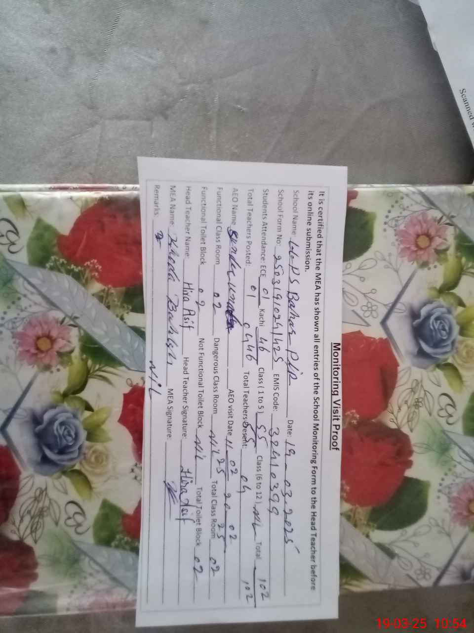 | Certified that this School was Inspected by the Undersigned MEA/DMO Today and the Information Stated Above is as Per Record. | |||||