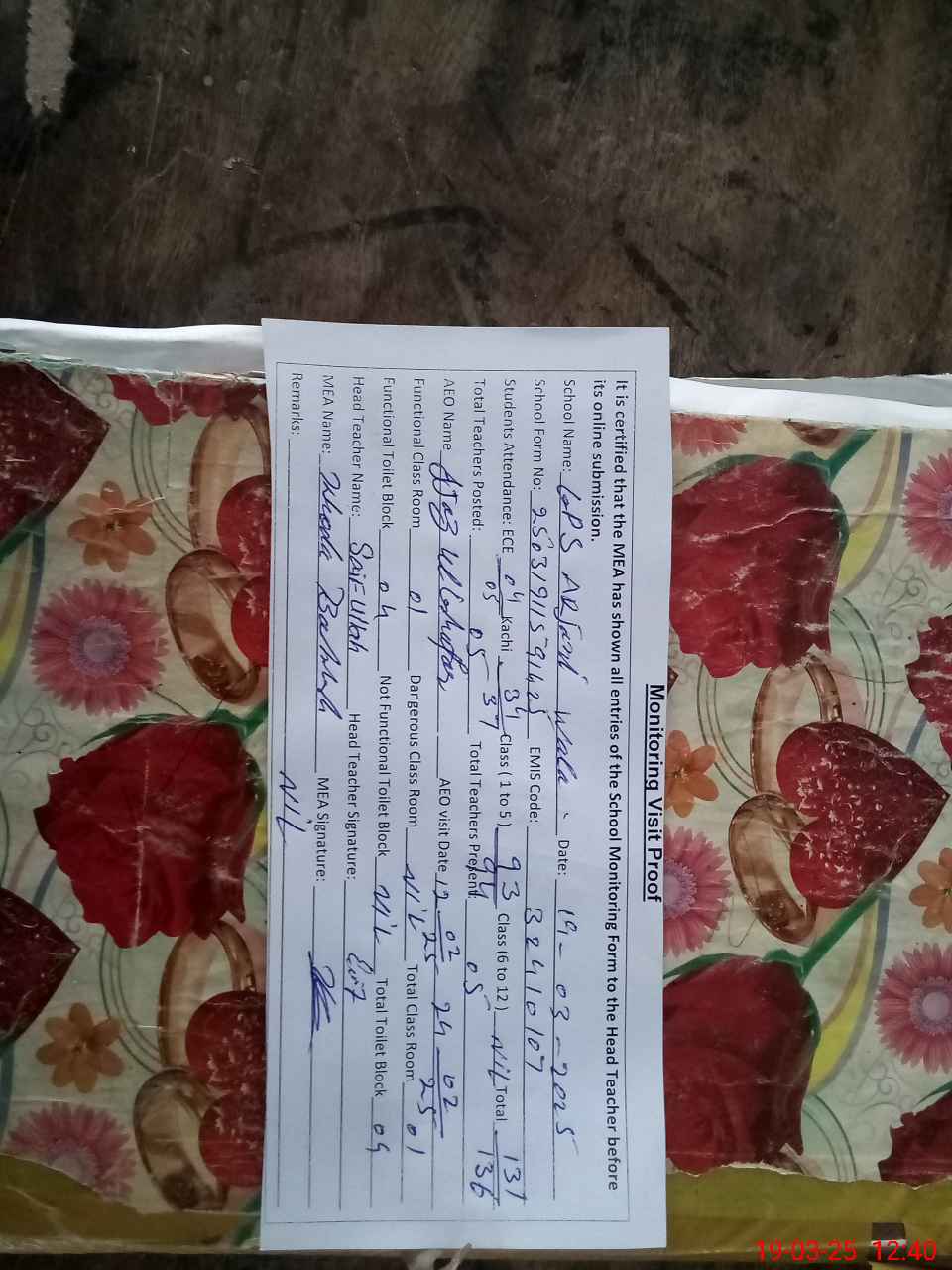 | Certified that this School was Inspected by the Undersigned MEA/DMO Today and the Information Stated Above is as Per Record. | |||||