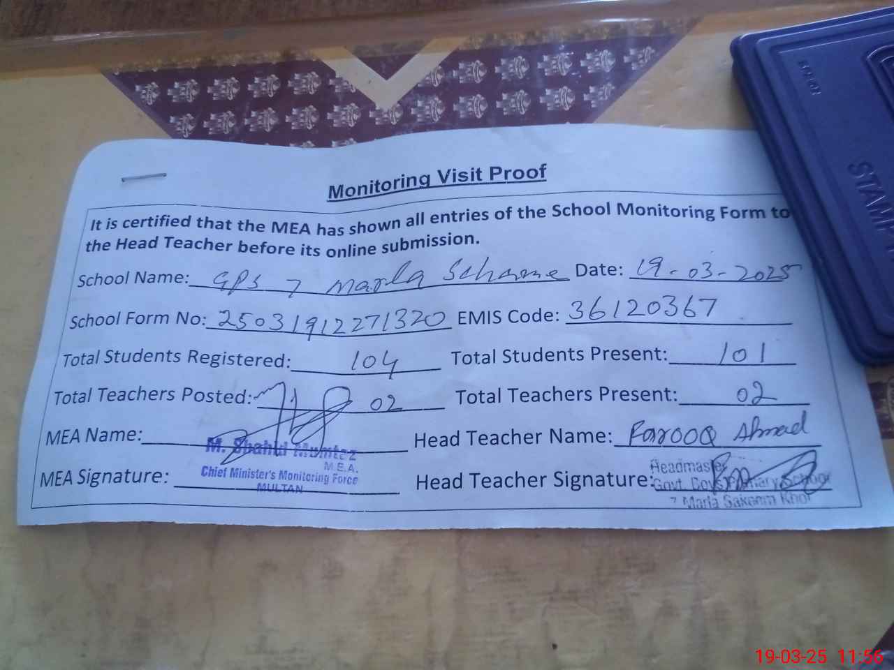 | EMIS Code: 36120367 | Name of School: GPS 7 MARLA SCHEME SHUJABAD | |||