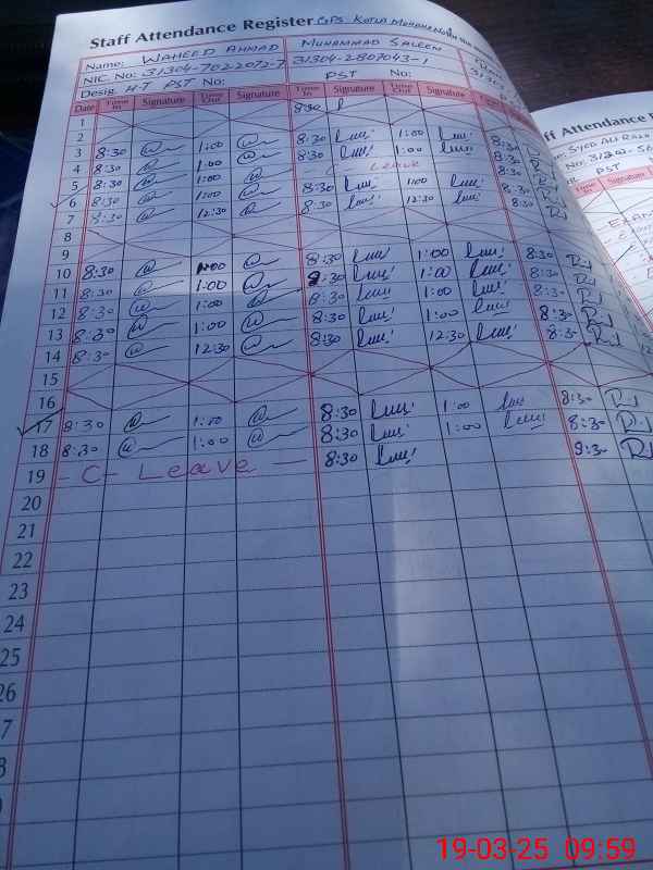 | 31**** | Sy**** Al**** Ra**** Bu**** | PST | Regular | 3 | 0 | 0 | 0 | 0 | 0 | 0 | 0 | 3 | Exam Duty |