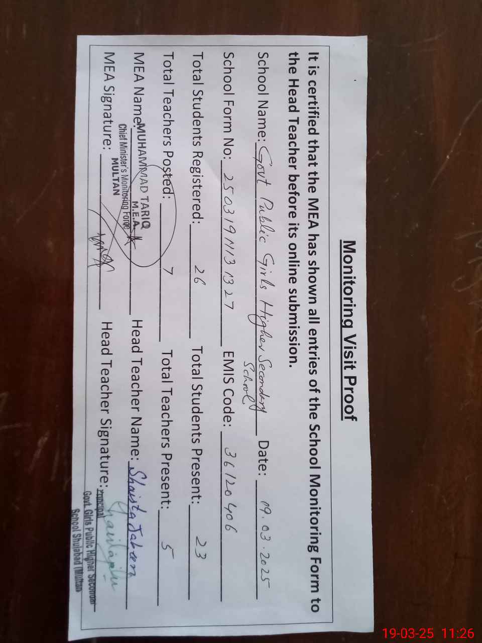 | Attendance Register | Head Teacher | MEA with School | Visit Proof |