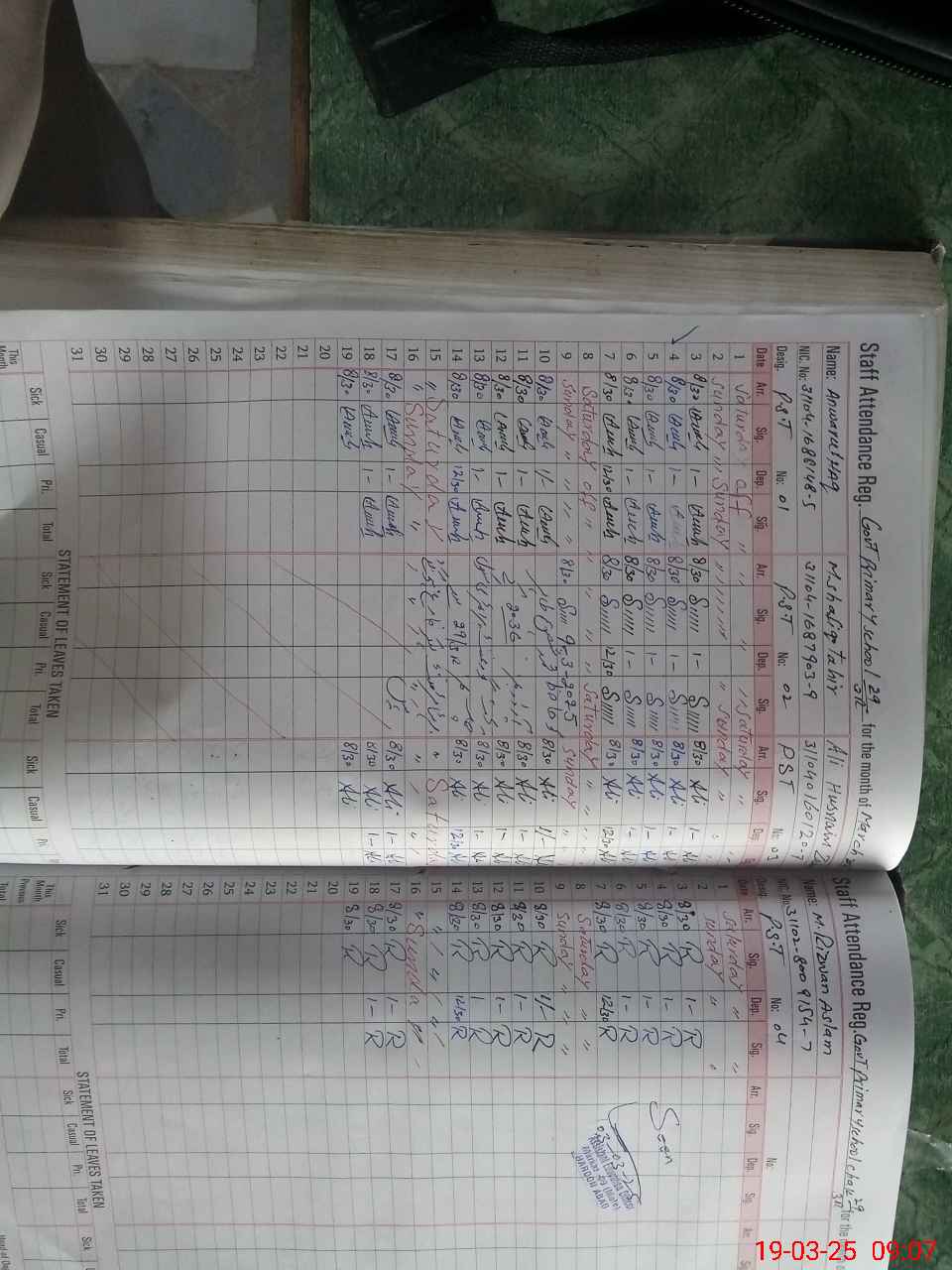 | CNIC | Full Name | Designation | R/C | Absence During Last Calender Month |