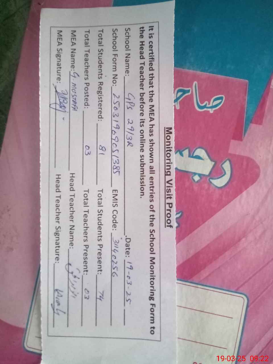 | Attendance Register | Head Teacher | MEA with School | Visit Proof |
