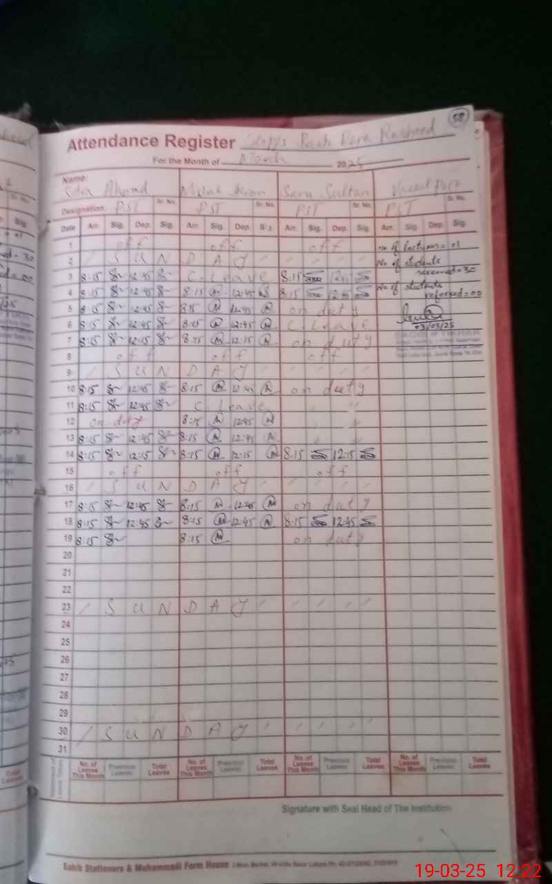 | CNIC | Full Name | Designation | R/C | Absence During Last Calender Month |