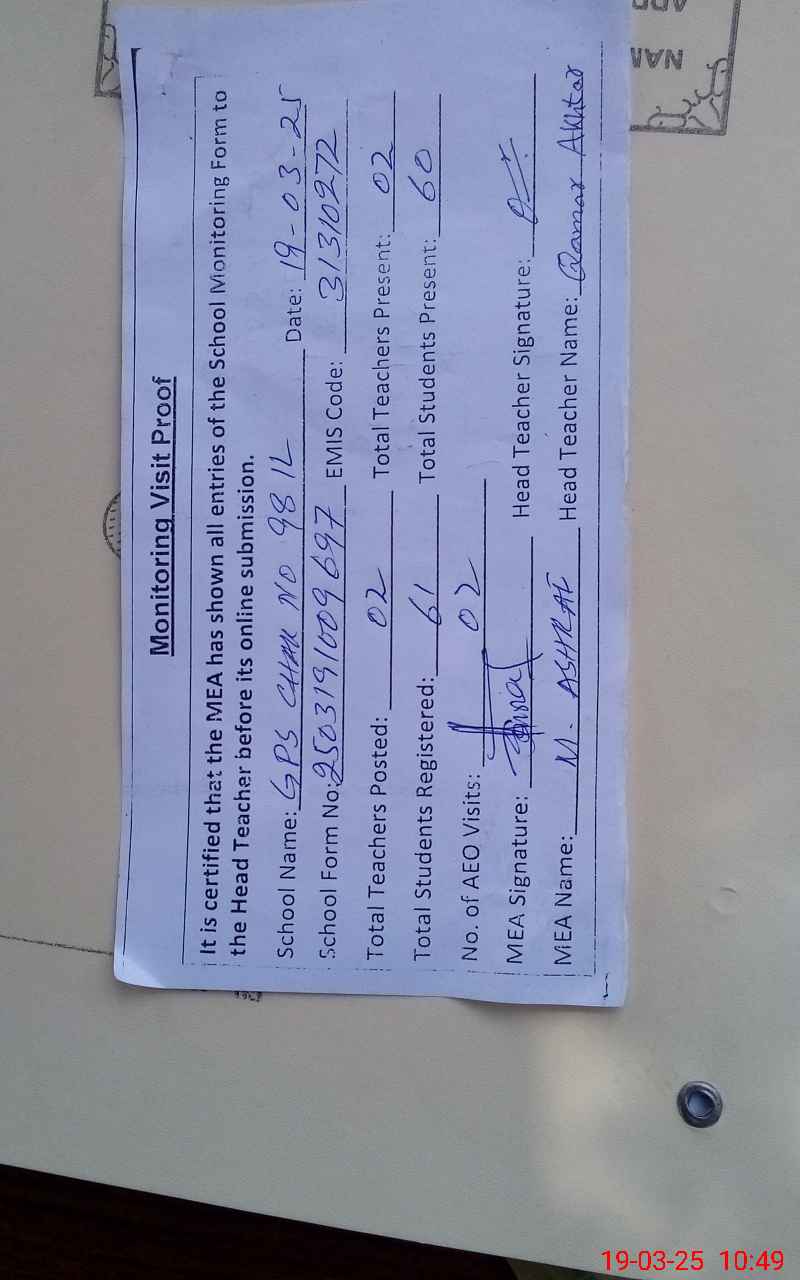 | EMIS Code: 31310272 | Name of School: GPS CHAK NO. 98 1/L (After Noon) | |||