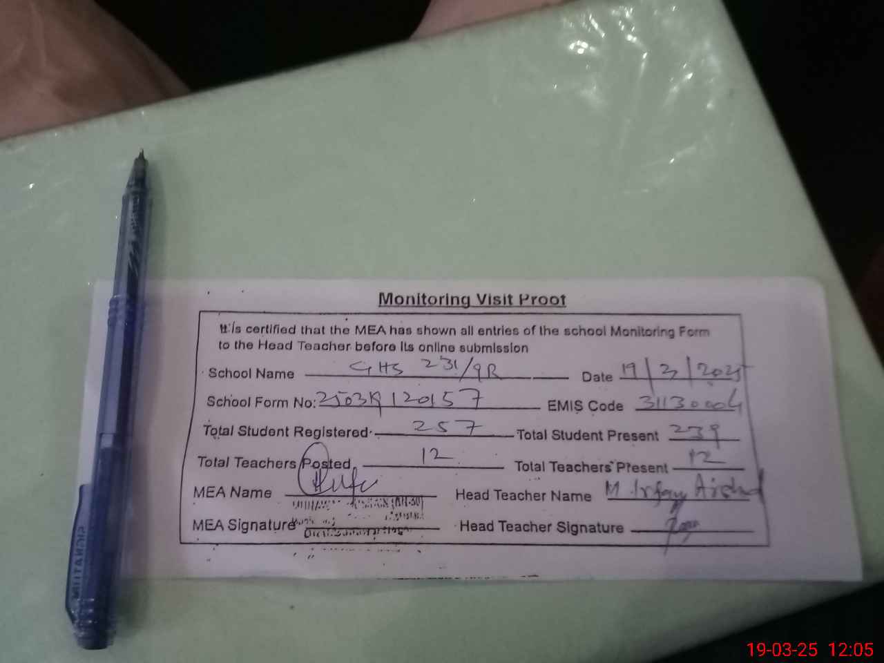 | Attendance Register | Head Teacher | MEA with School | Visit Proof |