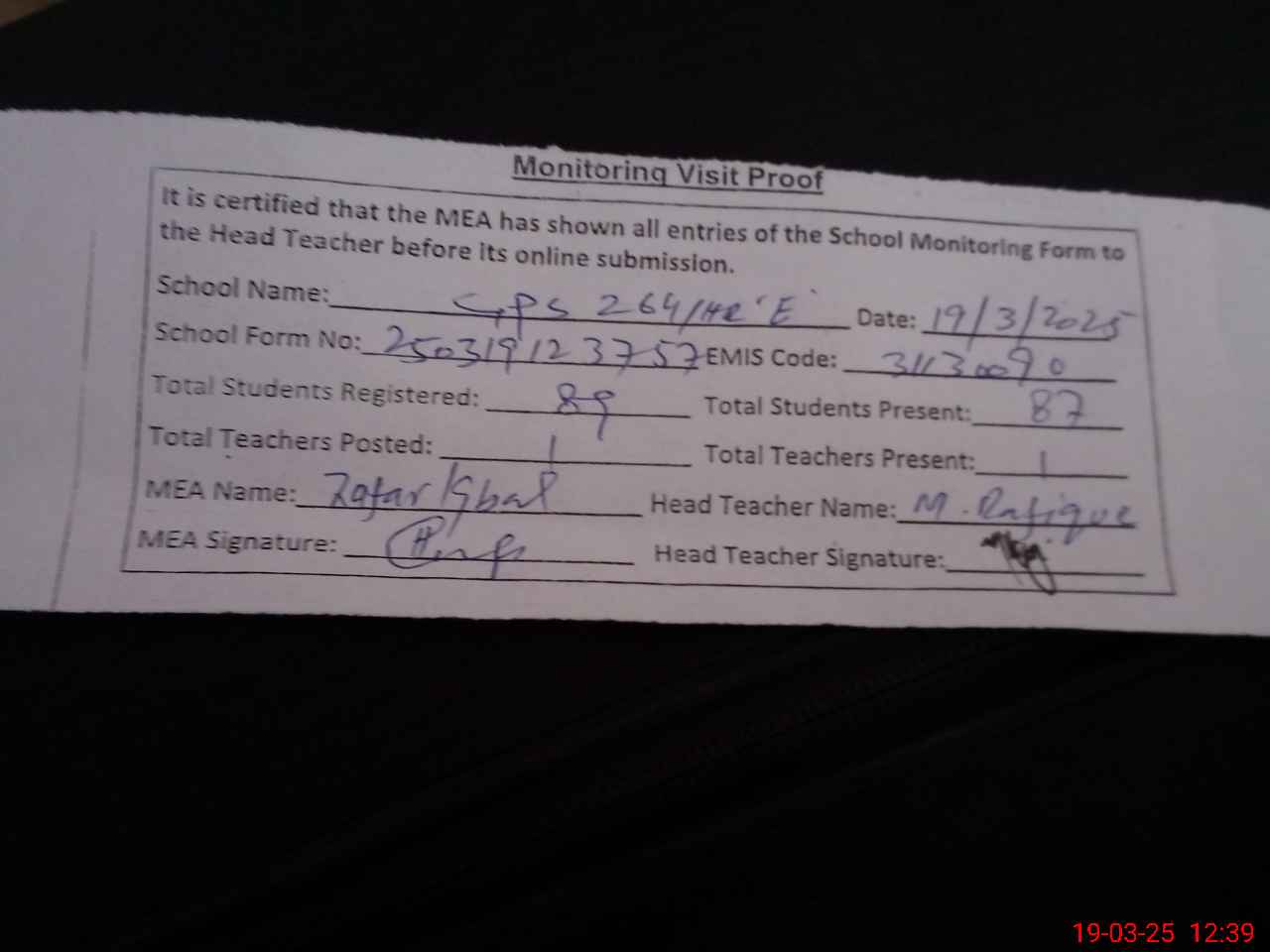 | Attendance Register | Head Teacher | MEA with School | Visit Proof |