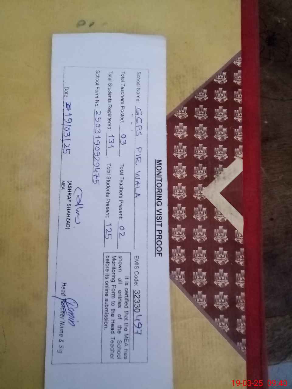 | Attendance Register | Head Teacher | MEA with School | Visit Proof |